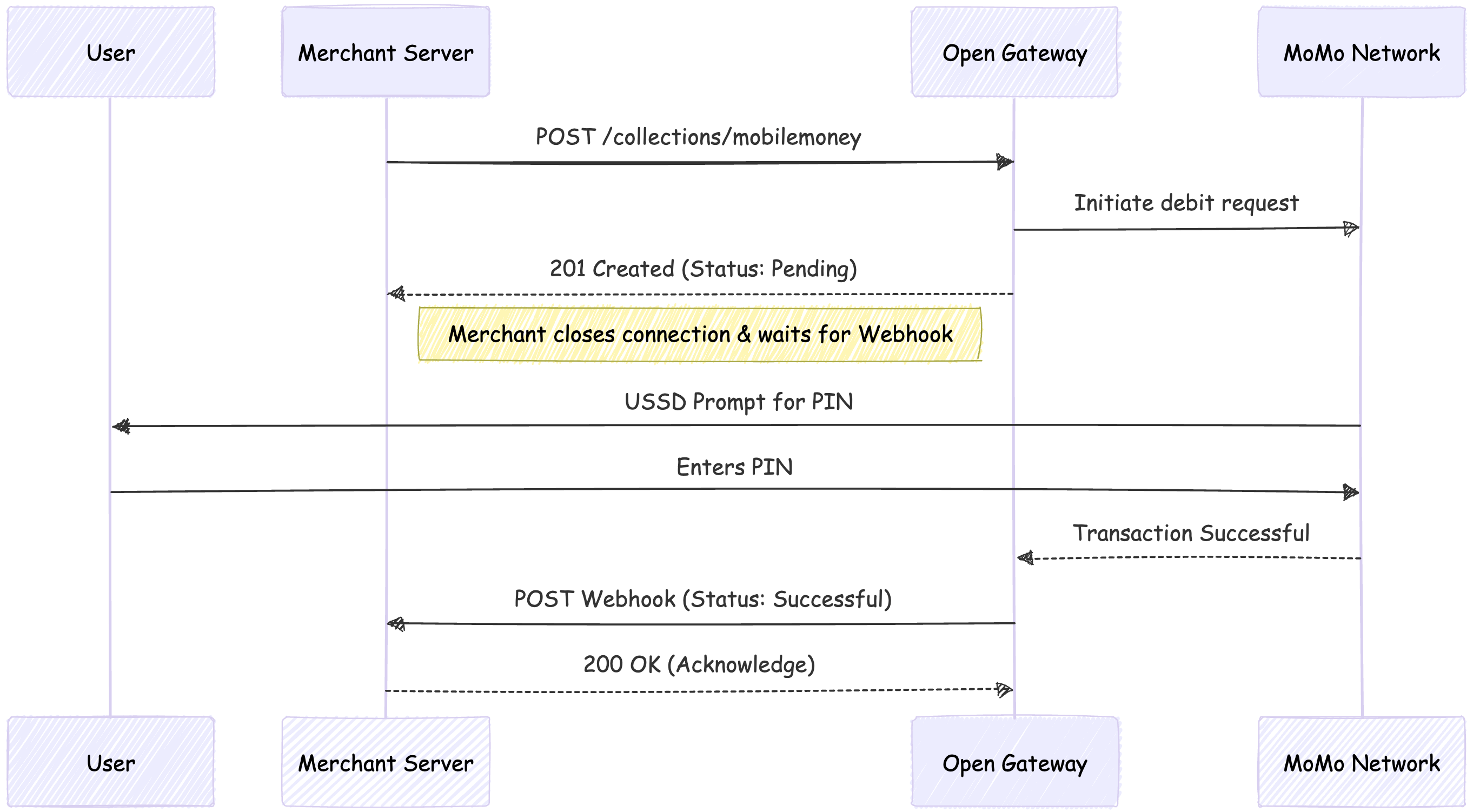POSTrequest with the customer's mobile money details to trigger the debit. - Prompt: The customer receives a USSD prompt (pop-up) on their mobile device instantly.